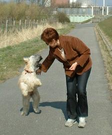 Hallo und einen guten Tag! Ich bin Kira Helms und muss Euch einfach mal erzählen, wie gut es mir mit der Swantje geht. Am 12.Januar 2006 bin ich geboren. Meine Mutter war eine Pudelmix Dame und mein Papa ein reinrassiger weißer Pudel (wirklich!). Christel und Dieter haben mich schon im Januar besucht und am 09.03.06 adoptiert. Ich war noch ganz klein und wuschelig (wuschelig bin ich heute auch noch). Eines Tages ging die Tür auf und Swantje kam. Die roch gut nach den vielen vorher besuchten Hunden und nach Linus. Das gefiel mir. Dieter und Christel fanden Swantje auch toll. Swantje zeigte ihnen viele Sachen und auch, wie die Menschen uns verstehen können. Die beiden durften mit mir auf dem Fußboden toben. Ich durfte unter den Beinen durchlaufen. Dann lag ich plötzlich platt da und sie riefen ”Platz”! Ich bekam ein Leckerli und habe dieses Spiel mit Begeisterung wiederholt. Wenn der Zeigefinger gehoben wurde, setzte ich mich hin und guckte niedlich und brav. Weil es gab wieder ein Leckerli. Dafür tat ich eine ganze Menge und Swantje zeigte mir viele Spiele, für die es Leckerli gab. Jetzt bin ich ein fast erwachsener Hund und die Kindereien sind mir in Fleisch und Blut übergegangen Aber ich bin immer noch gern in der Hundeschule und bei Swantje, denn die weiß, was uns Spaß macht und auch was uns fehlt. Das sagt sie dann unseren Menschen. Ich passe meistens gut auf. Auch ohne für jede gelungene Übung ein Leckerli zu verlangen. Meine hundischen Kolleginnen und Kollegen finden auch, dass der Unterricht bei Swantje viel Freude bringt und unseren jeweiligen Familien hilft. Auch für unsere unterschiedlichsten ”Fiesematenten” hat Swantje viel Verständnis, lässt aber nichts durchgehen. Na ja, wir müssen auch zeigen, dass wir keine Langeweiler sind. Das wir die Menschensprache verstehen, das verdanken wir auch nur unserer Swantje. Ich habe meine Kumpel gefragt, alle finden sie große klasse.