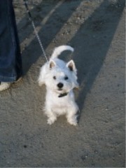 Beim ersten Kontakt mit Swantje waren wir noch der Auffassung, dass unser Westi ”Sammy” jeglichen Besuch aus Angst anknurrte und bellte und diesen auch deshalb nicht ins Haus lassen wollte. Schnell überzeugte uns Swantje jedoch vom Gegenteil, nämlich dass unser KLEINER eigentlich 2,10 m groß ist und nur so vor Selbstbewusstsein strotzt. Der Anfang war für uns drei echt schwer: als erstes musste Sammy sich von seinen Spielsachen (er besaß Unmengen davon) trennen, besonders seinen Ball vermisste er sehr und saß oft quiekend vor der Abstellraumtür, dorthin wurde es erst mal verbannt. Das Sofa war ab sofort tabu, was hieß, dass dort keine Schläferstündchen mehr abgehalten werden durften. Komischerweise hüpfte er öfter als vorher herauf und wir mussten ihn wieder hinunter setzen und ihm klar machen, dass er jetzt hier nichts zu suchen hatte. Schwer war es auch für uns ihn zu ignorieren, wenn er uns zum Spielen oder Streicheln aufforderte, weil er sich dann auf seine Hinterbeine setzte und uns mit seinen großen Knopfaugen anschaute. Zum Glück kapierte er schnell, dass er mit dieser Masche nicht mehr viel erreichte und zog dann beleidigt in sein Körbchen ab. Nach einigen Trainingsstunden mit Swantje fanden wir auch eine Lösungen wie wir Sammy davon abbringen können zu kläffen und auszurasten, wenn es klingelt. Da wir fast täglich diese Situation üblen, kriegt er sich meistens ganz schnell wieder ein. Wir sind froh, dass wir uns an Swantje gewendet haben und können Sie nur weiterempfehlen. Trotz oder gerade wegen Sammys großen Fortschritten werden wir uns im Frühjahr zum Gruppenunterricht anmelden, denn wir sind der Meinung, dass wir alle drei noch eine Menge von Swantje lernen können.